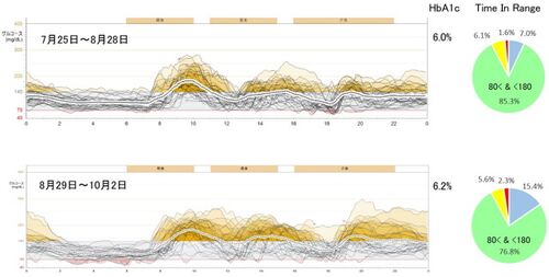 先日の木曜日(3日)が定期受診日でした。この数週間、高血糖になる頻度が高かったので、A1cも上がるだろうなと予想していました。結果は、予想通りで+0.2%でした。 Time-In-Range の変化を見れば一目瞭然で、80~180mg/dLの割合が前回の85.3…