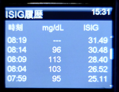 この時のISIG値は、①が28.40、②が37.16、③が52.48でCGMセンサが正常であることが確認しました。これらのISIG値から血糖値がどのレベルになっているかが分かるので、較正を諦め外出しました。今日は重要な会議に参加するので、低血糖を避けるためインスリンの注入は控え目でした。
