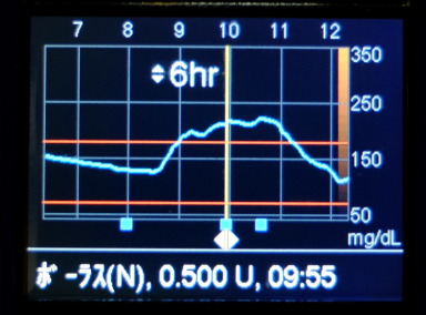 追加打ちによる低血糖を避けるため、1回目の追加は0.5単位に留めています(血糖値の上昇が大きい場合、追加打ちを1単位前後にすることもある)。