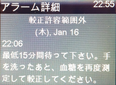 その日の夕方に較正を行う時も、ISIG値が高い。そのうち、ISIG値が下がり落ち着くだろう、と考えました。ところが、就寝前の実測で較正を行うと、較正許容範囲外のエラーになりました。