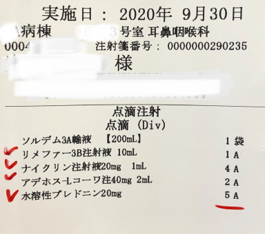 耳鼻科の医師から「発症後1週間以内にステロイド治療を行わないと効果が期待できないこと、ステロイド使用時の治療成績は完治が約3割、改善ありが約3割、不変または増悪が約3割となること、代替療法としてビタミン剤などを服用する方法がある」などの説明を聞き、ステロイド治療を選びました。「翌日に入院してください。すぐ治療を開始します」と医師から告げられ、慌ただしく入院になりました。