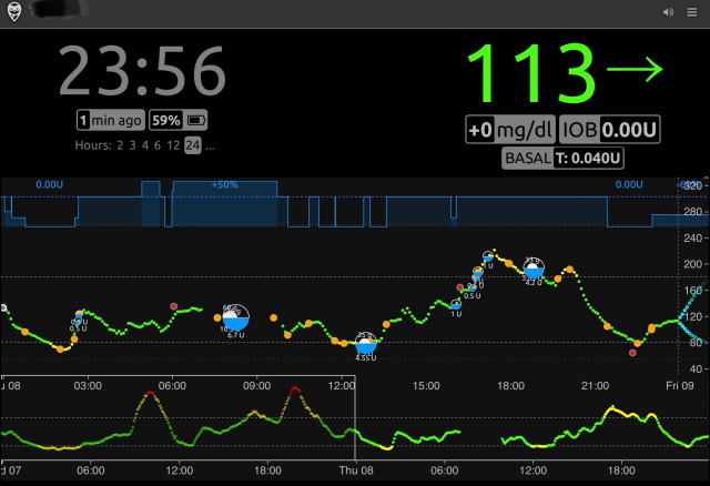 ステロイドの影響による上昇が15時すぎにきた。最初はじわじわと上がるので、気づきにくい。16:〜17時にかけて、0.5〜1単位を5回、合計4単位のボーラス。