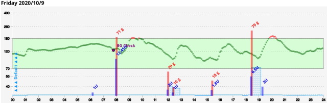 ヒューマログは射ってから効果が発現するまでに15~20分ほどかかるので、これまでは食前ボーラスから12〜15分後に食べ始めるようにしていました。作用のピークは約60分後ですが、このことはあまり念頭に置いていませんでした。