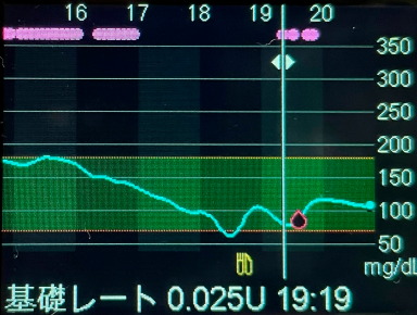下図で16:54にオート基礎で0.025単位の注入が行われた後、19:19まで基礎の注入が存在しない。要は、基礎の停止(0.025を含む)が2.5時間あったということで、DKA(糖尿病性ケトアシドーシス)を防ぐまてに、強制的にセーフ基礎注入に入るようです。
