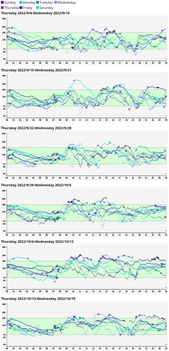 - 起床後に1単位のボーラスを始めてから、朝食の糖質比を元に戻した(6.8g/u ⇒ 7.2g/u ⇒ 7.5g/u と変更)。この結果、昼食前の補食が頻度と量で減少した