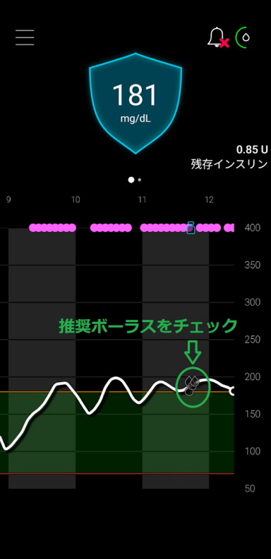 まず、推奨される補正ボーラスが表示されるかを確認した。