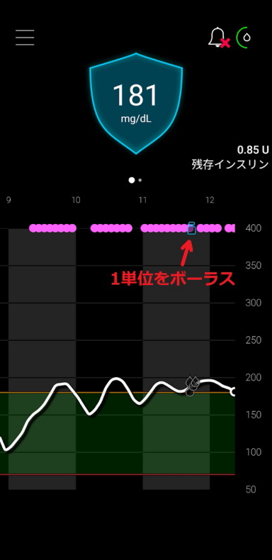 オート基礎で注入されたインスリンが足りないことが明らかなので補正をすることにした。
