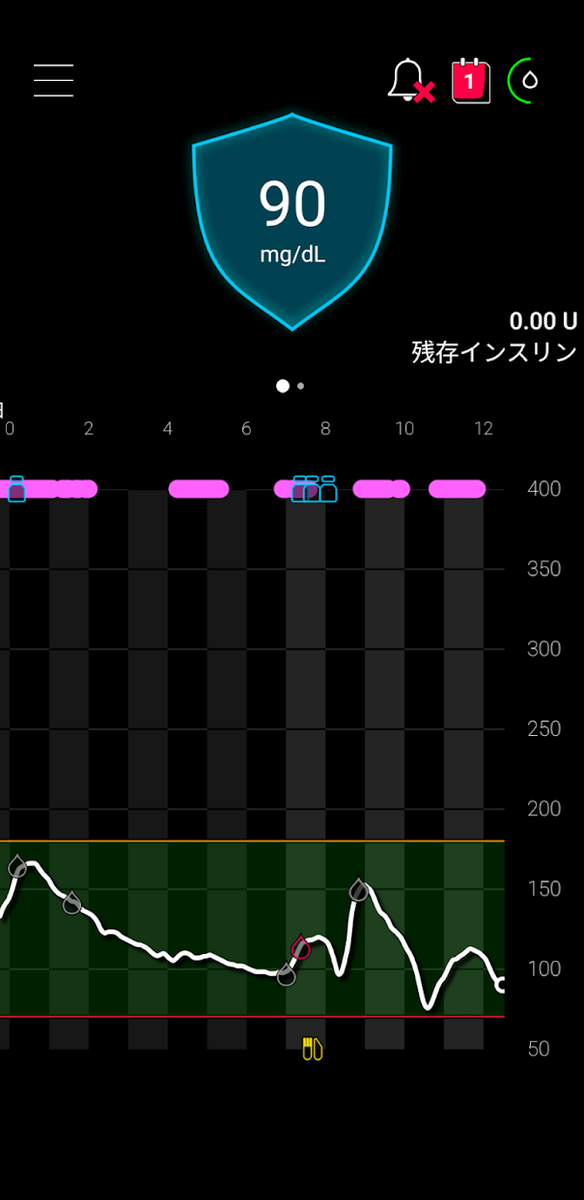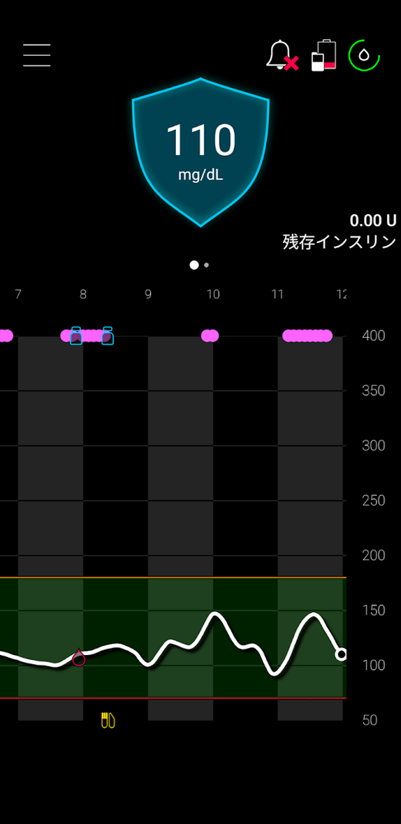 (記事「770Gで高血糖に対応する」の内容。以下同様) - 朝食のカーボカウント後、食事用のボーラスを行った ⇒ 補食・補正ボーラス不要
