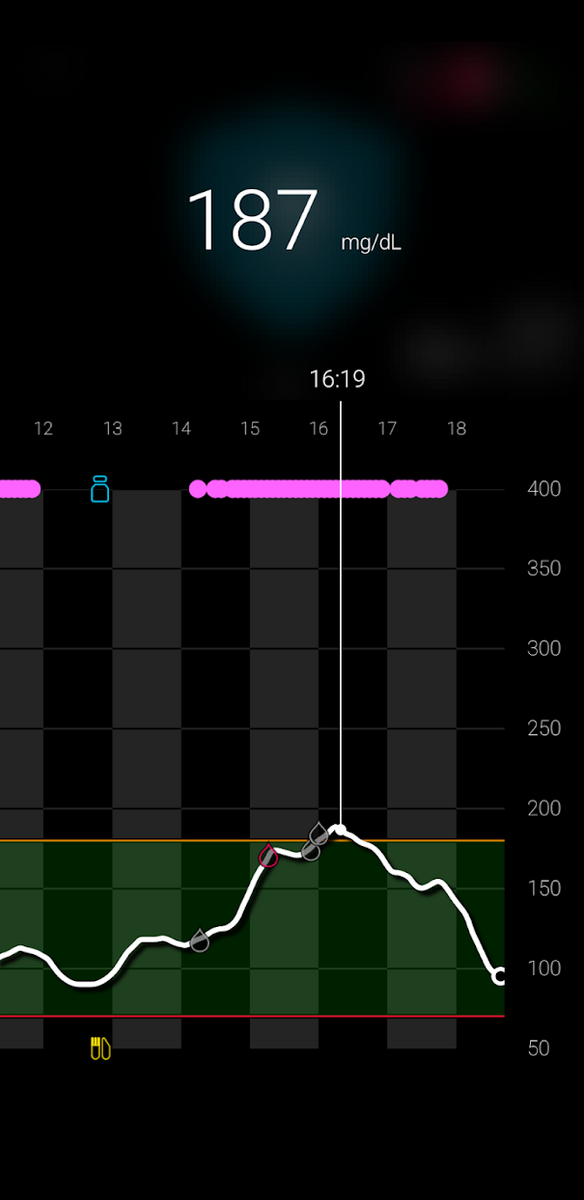 (ピークが187mg/dL、補正なしでオートのみで夕方95に下がった)