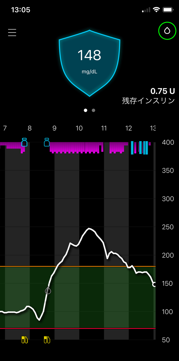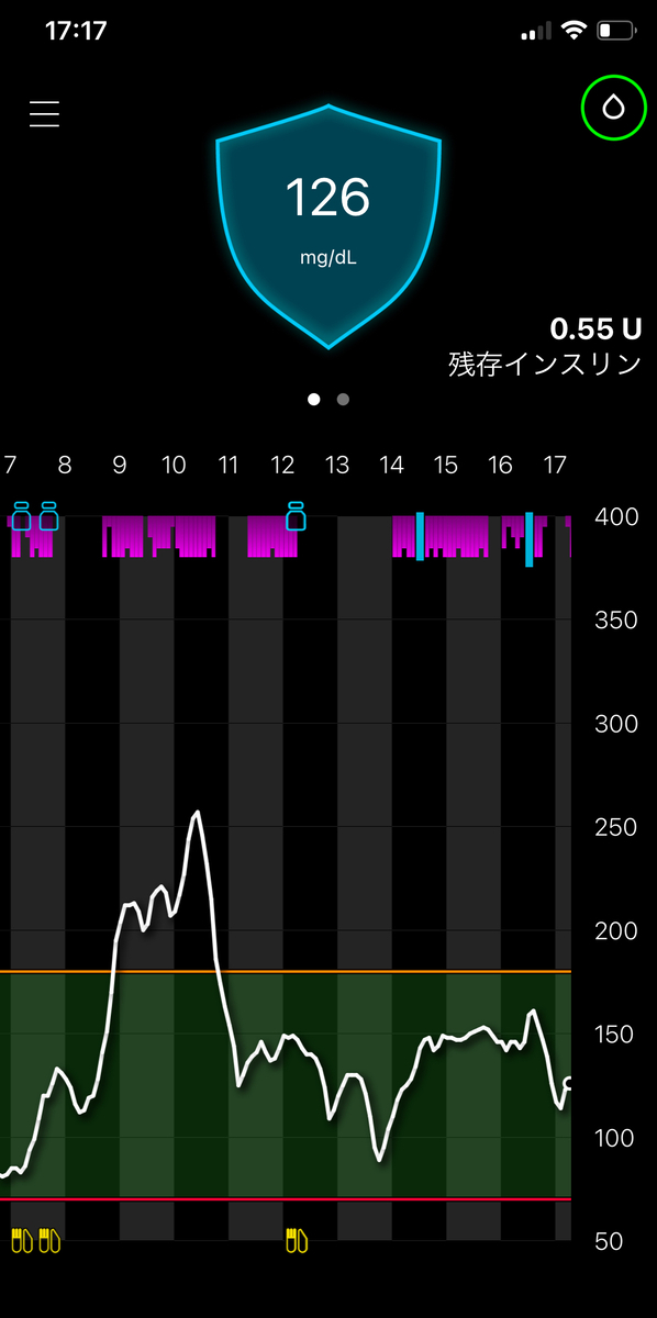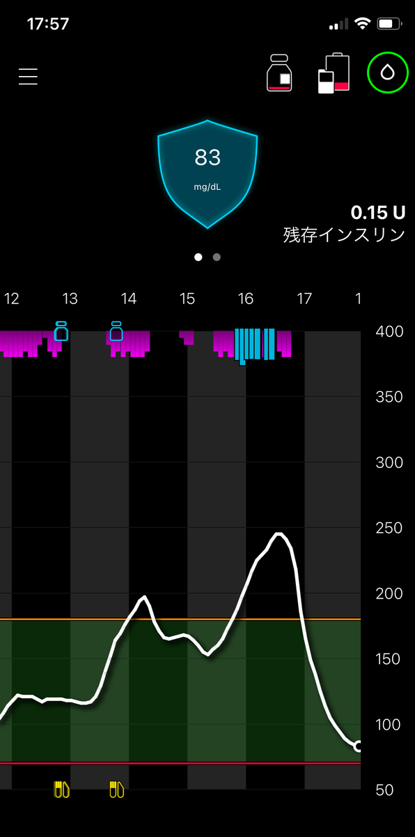 そこで、TDDを調整すれば、オート基礎レートと自動補正ボーラスを操作できる、との考えで、食前に実ボーラスと空ボーラスを組み合わせている(同じタイミングでこの2つを行う)。